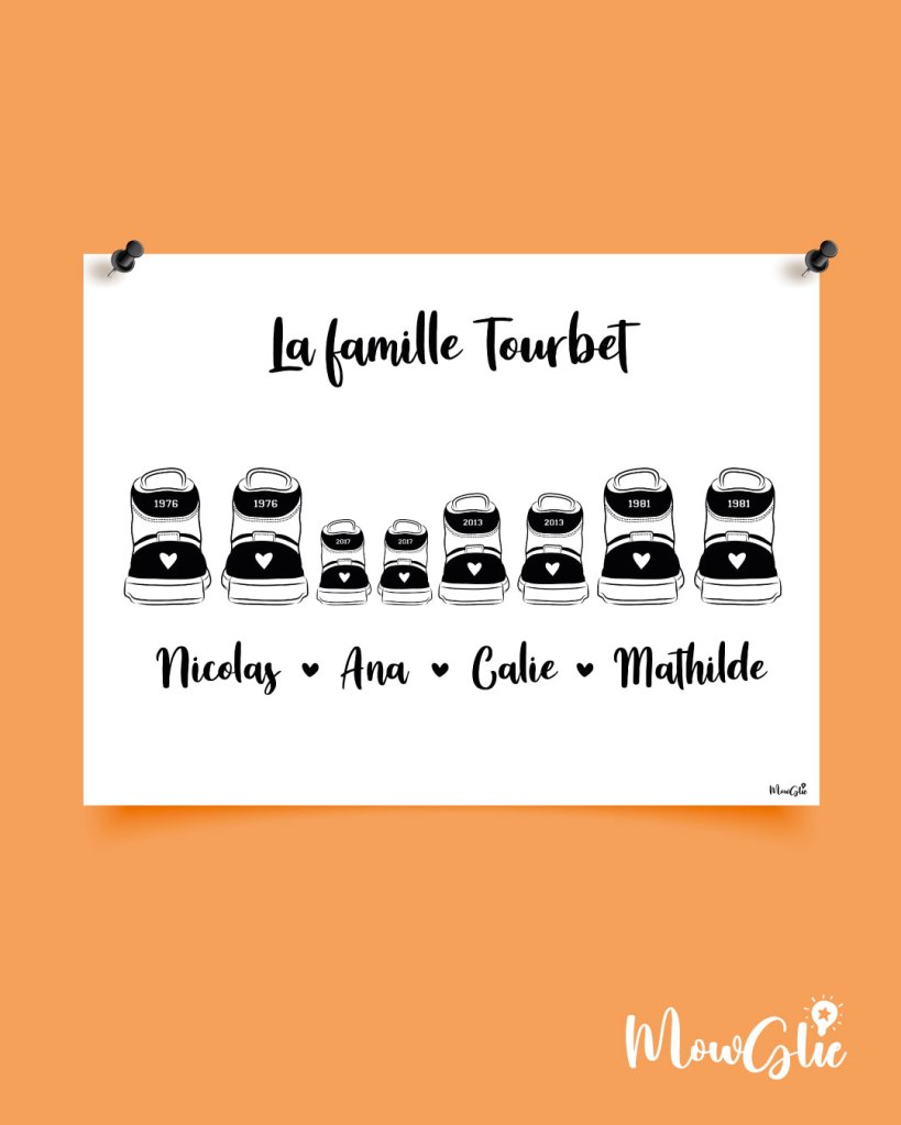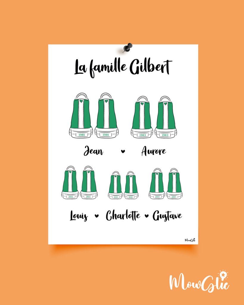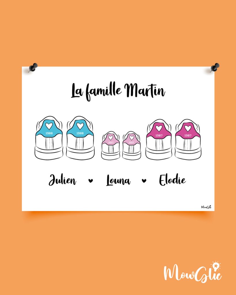 Un cadeau original pour les addicts aux sneakers ! 4 affiches disponibles avec 4 modèles de baskets différents (Stan Smith, Jordan, Vans et Converse). Recomposez votre famille avec le nombre de paires que vous souhaitez. Personnalisez le nom de famille, les dates et les prénoms. Choisissez les couleurs. Envoi d’un fichier numérique que vous pouvez imprimer directement chez vous. Dessins faits-maison.