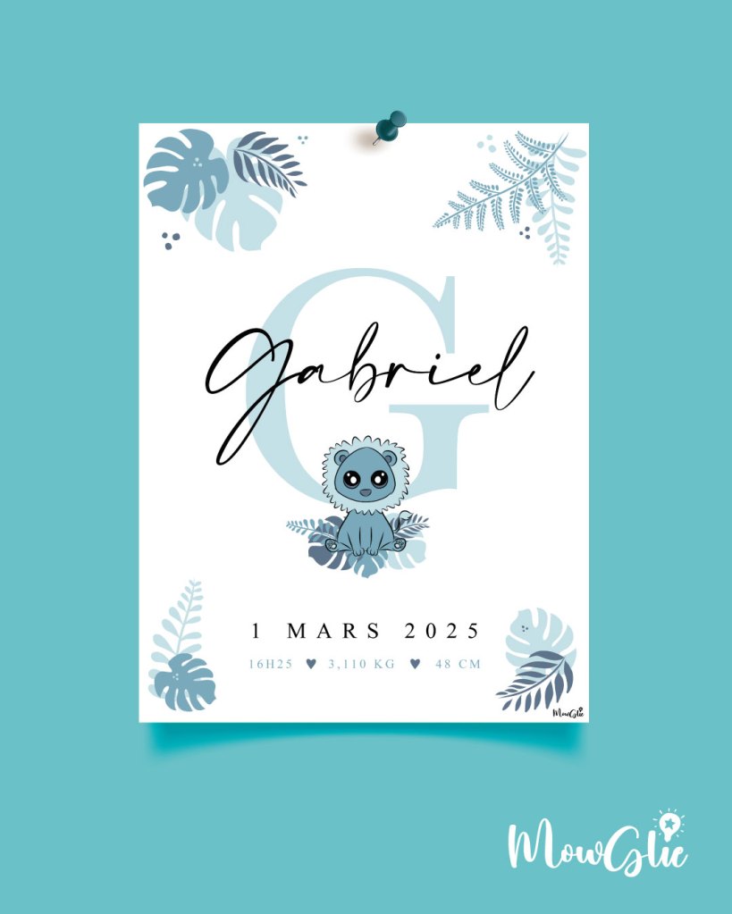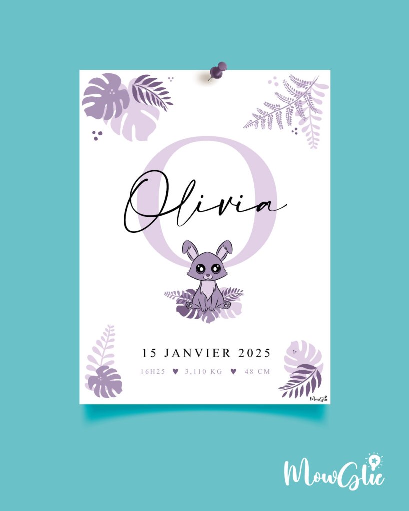 Un cadeau de naissance personnalisé et original . Personnalisez l’animal, le prénom, la date et les infos de naissance et la couleur. Format 30×40 cm max. Envoi d’un fichier numérique que vous pouvez imprimer directement chez vous. Dessins faits-maison !