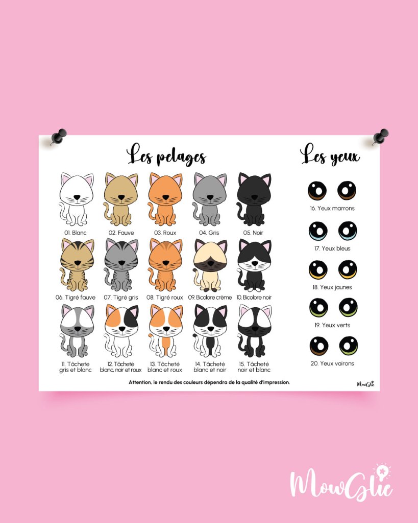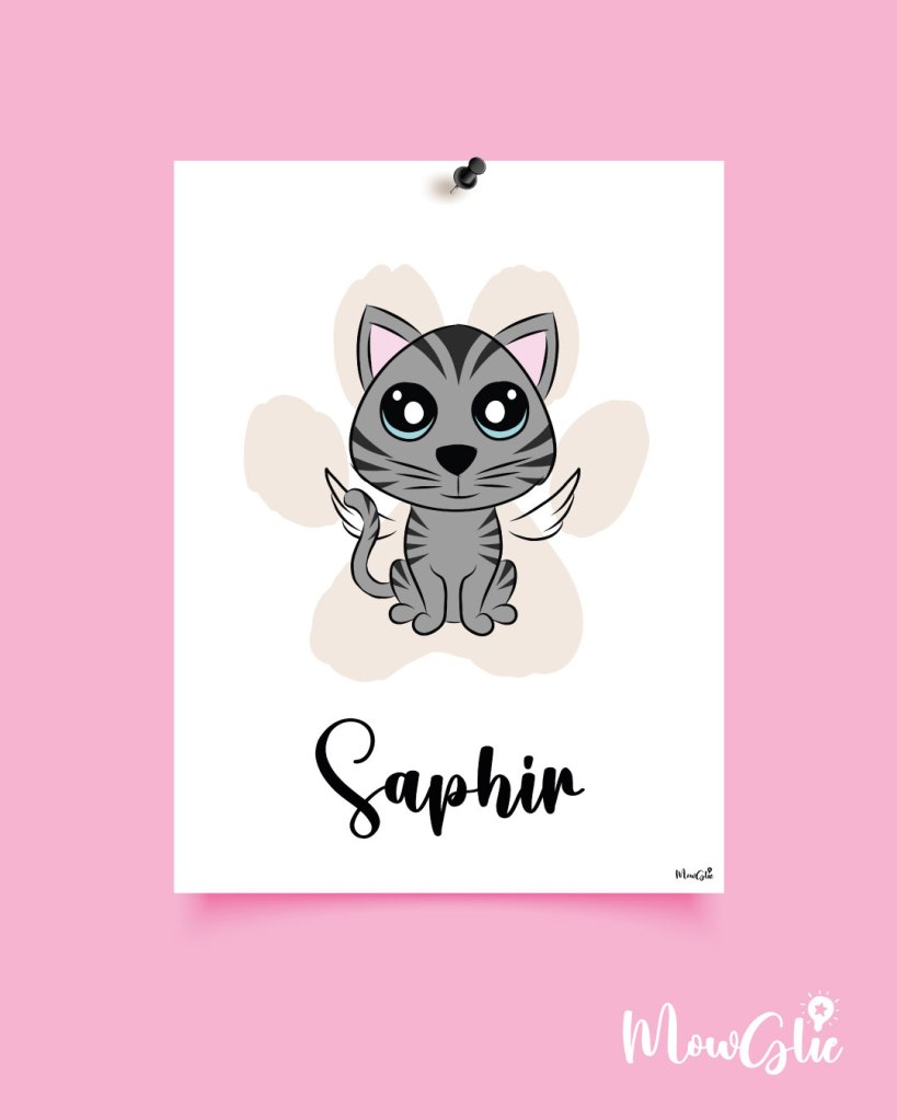 Un cadeau pour tous les amoureux de leur boule de poils qui voudraient un portrait rigolo de leur compagnon à 4 pattes 🐾 ou un souvenir de leur chat-ange. 2 affiches différentes : les chats à poils courts et longs. Personnalisez le nom. Choisissez parmi 15 couleurs de pelage et 5 nuances pour les yeux. Possibilité de rajouter une paire d’ailes. Format max 30×40 cm. Envoi d’un fichier numérique que vous pouvez imprimer directement chez vous. Dessins faits-maison.