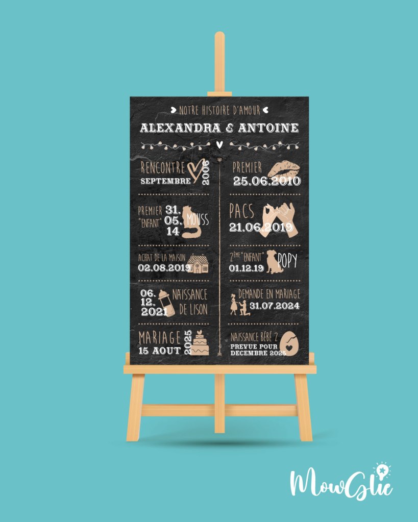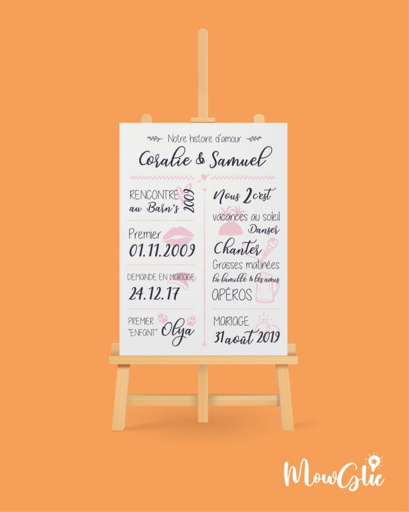 Création du faire-part, des menus, affiches, toile histoire d’amour, cadeaux invités, badges, totebag…