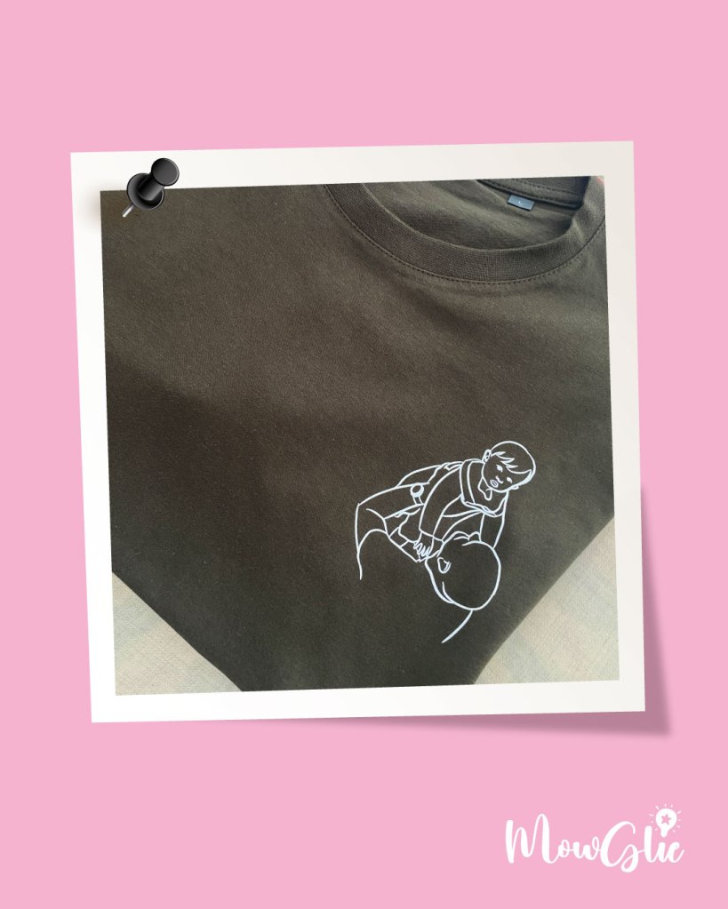 T-shirt marqué avec un dessin fait-maison d’après une photo. Marquage sur t-shirt fait maison également. T-shirt en coton bio disponible dans + de 20 coloris. Délai pour la fabrication : 3 semaines.